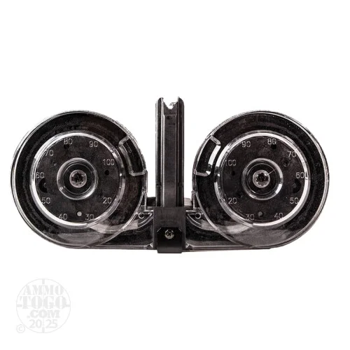 rThis mag weighs approximately 5 lbs loaded; 2.1 lbs unloaded. It keeps its weight evenly distributed by alternating the drums it feeds ammo from. Independent follower belts and steel-reinforced feed lips provide a smooth and consistent feed.