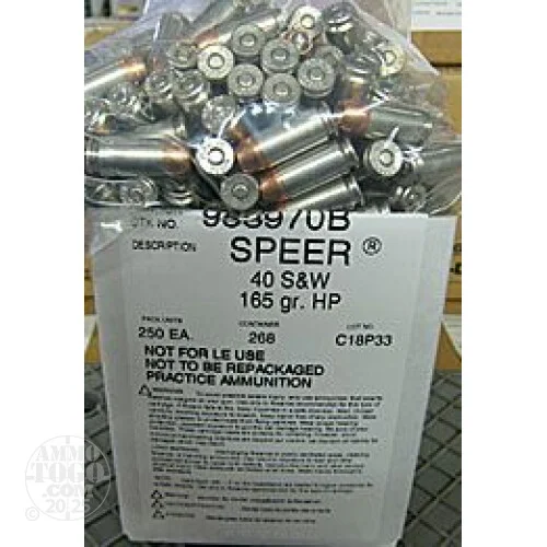 This is40 S&WSpeer Gold Dot 165gr.Hollow PointAmmo. This ammo was manufactured for a law enforcement agency and did not pass thesubmersion test.So the sealant failed around the primer or case mouth. All that means is that this ammo may not funtion if you submerge it underwater. This ammo was then put in 250rd. boxes and sold to the civilian market. This is still excellent ammo and functions flawlessly. Most commercial ammo is not sealed anyway, so the sealant failing is not a big deal. Take advantage of the savings on this ammo. It is 75% off the regular price of40 S&WGold Dot. This ammo will come packed loose in 250rd. boxes.