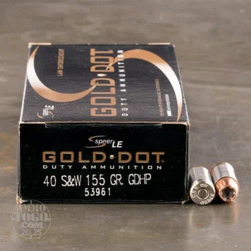 These lightweight .40 Smith & Wesson rounds are a shining example of Speer’s innovative approach to ammunition which enhances performance in every aspect. Each cartridge is ignited by a clean-sparking Boxer primer which leaves behind no corrosive salts or mercury. The primer and the reloadable brass casing to which it is attached are both nickel-plated to resist moisture in storage as well as to lower friction; this makes feeding and ejection much more smooth and reliable. The case is filled with a low-flash propellant which helps shooters regain a faster sight picture. Speer tops off this particular load with a 155-grain Gold Dot hollow point (GDHP) projectile.