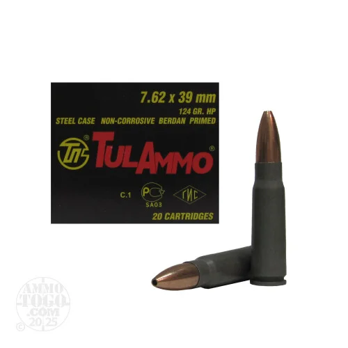 This is 7.62×39 Tula 124gr. Hollow Point Ammo.This ammo is made atUlyanovsk Cartridge Works in Russia. This ammo has apolymer coated steel case. It is berdan primed and 100% non-corrosive.It comes packed in20rd. boxes.