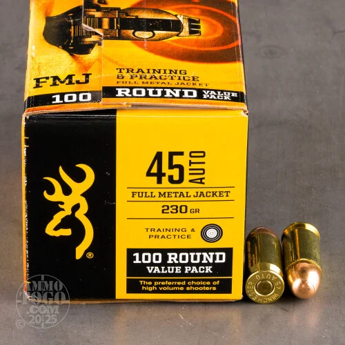 rThis is high-quality American-made range and target ammo, so its bullet is nothing more sophisticated than the 230 grain full metal jacket. Its weight and 835 fps muzzle velocity are precisely what 1911 pistols like, but any firearm chambered for 45 is going to tear through this ammo like a youth football team at an all-you-can-eat pizza buffet. The FMJ’s copper-alloy jacket makes it unable to attract a magnet, and its round nose profile assures reliable feeding in all sorts of semi-automatics.