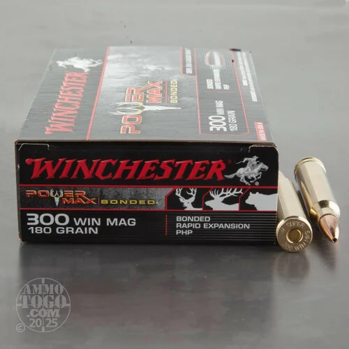 This is .300 Win. Mag Winchester 180gr. Power Max Bonded PHPAmmo. Power Max is the newest ammo Winchester has to offer and it is specially designed for the whitetail deerhunter. Power Max begins by weldingthe lead to a copper alloy jacketso the two act together during expansion for improved penetration and retained weight. Power Max uses a contoured jacket taper that is engineered to work with thisbonding process. The aerodynamic design of the PHP – Protected Hollow Point -bullet design promotes long range accuracy and initiates maximum expansion. The bonding process keeps the lead adhered to the jacket after the expansion. The result of the engineering features working together is toprovide massive expansion allowing for dramatic upset/knockdown. This ammo comes packed in 20 round boxes.