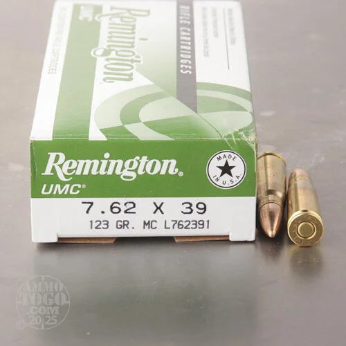 This is 7.62×39 Remington UMC 123gr. Full Metal Jacket Ammo. It is brass cased, boxer primed and non-corrosive. It is great plinking ammo. It comes packed in 20rd. boxes, 10 boxes per case.
