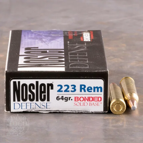 This is .223 Nosler Defense 64gr. Bonded Solid Base Soft Point Ammo. Nosler Defense rifle ammunition is loaded up front with the .224 caliber, 64 grain Bonded Performance bullet that is designed for 90% weight retention, minimal deflection and true, straight-line penetration. These rounds provide you the same accuracy and precision that you expect from any Nosler line of ammunition combined with a high performance bonded projectile specifically designed for Modern Sporting Rifles that will provide the penetration and controlled expansion of high end self defense round. This ammo is brass cased, boxer primed, non-magnetic and non-corrosive. This ammo comes packaged 20rds to a box. Muzzle Velocity: 2750 FPS.