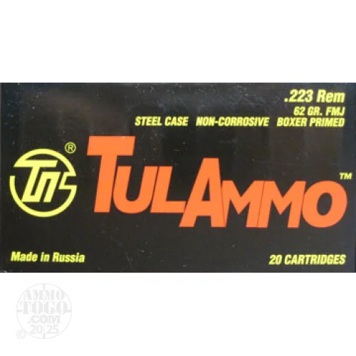 This is .223Tula 62gr. Full Metal Jacket Ammo. This ammo has the polymer steel case and is non-corrosive. This is good plinking ammo.It has a magnetic bi-metal jacket. It comes packed in 20rd. boxes.
