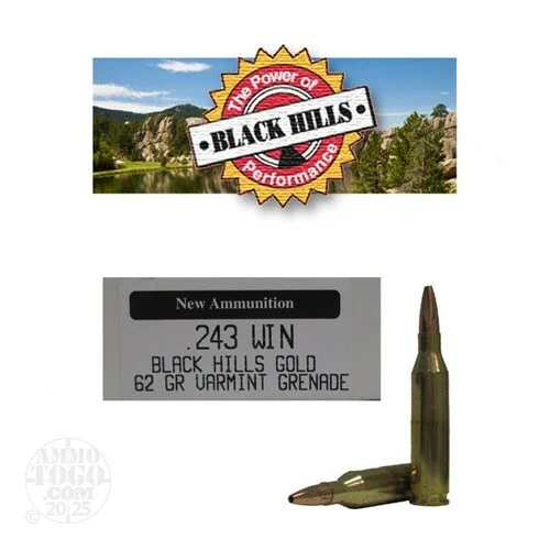 This is .243 Black Hills 62gr. New Seconds (Cosmetic Imperfections) Varmint Grenade Hollow Point Ammo. This ammo goes through Black Hills stringent inspection tests and due to minor cosmetic blemishes on the bullet or casing, it then becomes factory seconds (white box) ammo. Performance is not affected. This is premium ammo, with a great savings. Black Hills supplies all four of our military branches with ammunition. There are many Law Enforcement Agencies using Black Hills nationwide. They only use the best components available. Black Hills Ammunition is highly respected all over the country. This ammo is very accurate, dependable, 100% non-corrosive, boxer primed and reloadable. It comes packed in 20rd. boxes.
