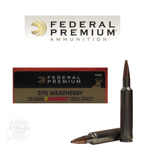 This is .270 WBY Federal 130gr. Barnes Triple Shock Ammo.The Barnes Triple Shock is anon-lead performer and is designed for improved expansion and deep penetration.Features such as an all-copper construction for high weight retention coupled with reduced pressure, reducedbarrel fouling, and increased accuracy all addtogether guarantee tobring game down hard. Fast (3200fps) and hard hitting (2956ft-lbs), you simply can’t go wrong. You spend all year dreaming of the big moment, so why trust it to anything but the best?This ammo comes packed in 20 round boxes.