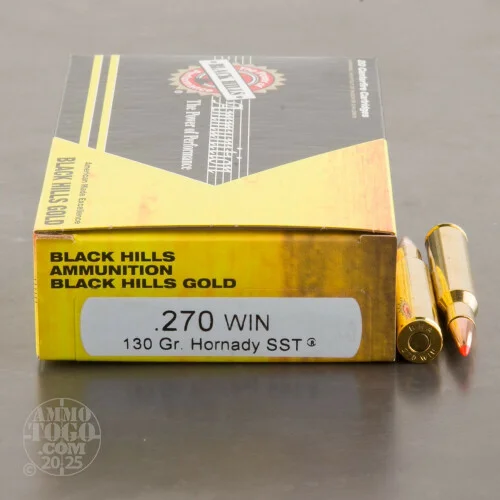This is .270 Win. Black Hills 130gr Hornady SST Ammo. Streamlined for ultra-flat trajectories. Polymer tip for rapid expansion and maximum energy transfer. Match-grade jacket delivers surgical accuracy. Heavy construction with InterLock feature delivers deep penetration every time. Black Hills Ammunition is highly respected all over the country. Black Hills supplies all five US military branches with ammunition. There are many Law Enforcement Agencies using Black Hills nationwide. They only use the best components available. This factory new ammo is very accurate, dependable, 100% non-corrosive, boxer primed and reloadable, and it comes packed in 20rd boxes.