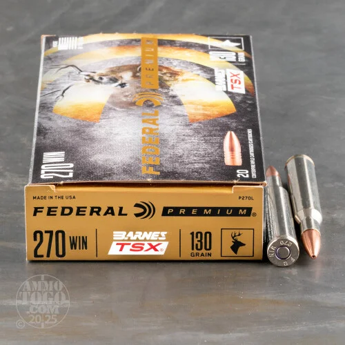 Are you ready to give your hunt the power of copper? This 270 Win cartridge by Federal is crowned with a 130 grain Barnes TSX projectile, the exclusive copper composition of which enables it to foul a rifle’s bore very little, retain nearly the entirety of its weight during penetration, and comply with California’s unyielding ammunition laws. This bullet’s exceptional weight density, as well as the four pressure relieving grooves encompassing its shank, make it extremely accurate, and the latter further serve to lessen bore fouling. The TSX’s long nose cavity enables it to expand dramatically even at lower velocity impact, and the cutting petals it produces make it particularly lethal to game.