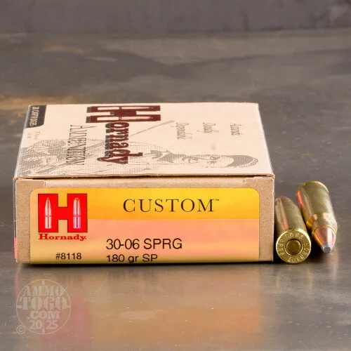 Hornady Custom ammunition gives you handloaded quality and factory consistency in a cost-effective package. These soft point cartridges in .30-06 Springfield are a reliable companion for any hunter looking to take deer, elk, or other midsize to large game. Each round in this box of 20 fires a heavy 180 grain soft point bullet designed to deliver optimal expansion and strong penetration without excessive fragmentation and meat loss. Like other Hornady products, this ammo is made in Nebraska using re-loadable brass and non-corrosive primers.