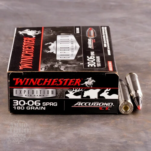 This is.30-06 Winchester Supreme 180gr AccuBond Bonded Ammo.Delayed, controlled expansion. Deep penetration through thick, tough skin, heavy muscle tissue and bone, high retained weight. Polymer Tip, Bonded Alloyed Lead Core, Lubalox (Black Oxide) Coating, Controlled Expansion. This ammo is nickel plated brass cased, boxer primed, non-magnetic and 100% non-corrosive. This ammo is packed in 20rd. boxes.