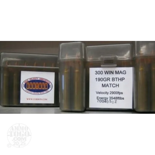 This is 300 Win. Mag Corbon Performance Match 190gr. Boat tail Hollow Point Ammo.Uniformity and accuracy are the key ingredients in CORBON’s Perfomance Match ammunition. Utilizing match grade components, it’s the perfect choice for the combat target shooter, I.D.P.A. competitor or law enforcement officer. If you are looking for high velocity target ammunition with high accuracy, Performance Match should be your choice. Like no other, Corbon’s JHP loads have proven stopping power. Their JHP loads come loaded with higher velocity and more energy values then their competitors. What you’ll get is a bullet traveling faster, but on impact the higher velocity will cause the hollow point to expand into A mushroom shape dispersing its energy into the target. Energy dispersal is the key to COR-BON’s proven stopping power. This ammo comes packed in 20rd. boxes. This ammo travels at 2900FPS and has3549FTLBS of energy.