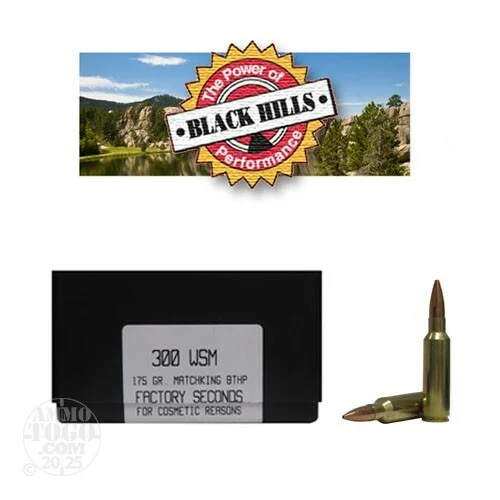 This is .300 WSM Black Hills Gold 175gr. New Seconds Matchking Boat Tail Hollow Point Ammo. This ammo goes through Black Hills stringent inspection tests and due to minor cosmetic blemishes on the bullet or casing, it then becomes factory seconds (white box) ammo. Performance is not affected. This is premium ammo, with a great savings.Black Hills Ammunition is highly respected all over the country. Black Hillssupplies all four ofour military branches with ammunition. There are many Law Enforcement Agencies using Black Hills nationwide. Theyonly use the best components available. This factory new ammo is very accurate, dependable, brass cased, 100% non-corrosive, boxer primed, non-magnetic and reloadable. This ammo comes packed in 20rd. boxes.