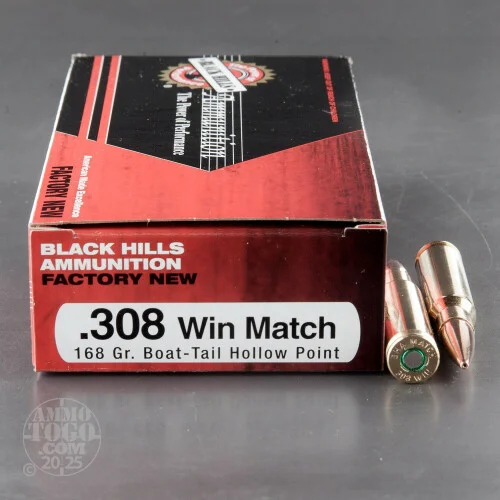This is 308 Black Hills 168gr. Match Boat-Tail Hollow Point Ammo.Black Hills Ammunition is highly respected all over the country. Black Hillssupplies all five US military branches with ammunition. There are many Law Enforcement Agencies using Black Hills nationwide. Theyonly use the best components available. This factory new ammo is very accurate, dependable, 100% non-corrosive, boxer primed and reloadable. This ammo is brass cased andcomes packed in 20rd. boxes.