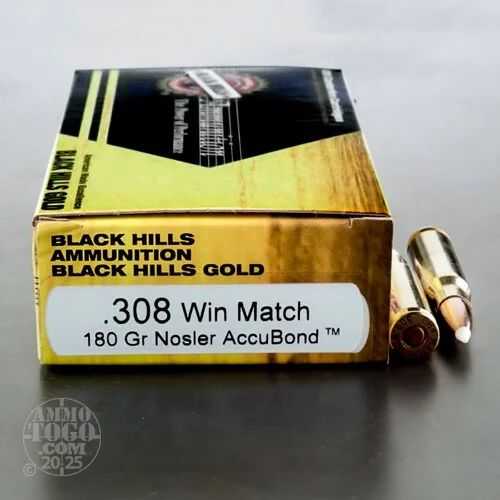 This is.308 Black Hills Gold 180gr.Nosler AccuBondBallistic Tip Ammo. This ammo has the Nosler AccuBond Tip.Black Hills Ammunition is highly respected all over the country. Black Hillssupplies all five US military branches with ammunition. There are many Law Enforcement Agencies using Black Hills nationwide. Theyonly use the best components available. This factory new ammo is very accurate, dependable, 100% non-corrosive, boxer primed and reloadable. Black Hills. This ammo is brass cased, non-corrosive,comes packed in 20rd boxes.