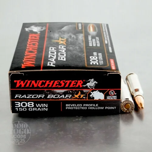 This is .308 Winchester Razorback XT 150gr. Beveled Profile Protected Hollow Point Ammo.Razorback XT ammunition is designed specifically for the rugged demands of boar hunting. It drives through thick hide and bone to deliver lethal impact on the toughest wild boars. Engineered hollow point is optimized for delayed expansion through heavy hide. Winchester loaded these rounds with a low flash powder that reduces muzzle flash, preventing night blindness. Lead-free bullet offers maximum weight retention and strength. Muzzle velocity of 2810 fps. This ammo is packed in 20rd. boxes.