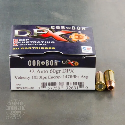This is .32 ACP Corbon60gr. DPXHollow Point Ammo. Corbon products have earned a distinctive reputation in the industry with their high energy JHP ammunition. They maintain that standard with this new DPX line, it has a deeper penetration to make it the optimum load for Law Enforcement and civillian use. This ammo is loaded with the Barnes X Bullet, which retains 100% of its weight, even after shot through barriers such as clothing and steel. The permanent crush cavity is considerably larger than a typical hollow point due to deeper penetration. The Barnes X-Bullet is a solid copper projectile, heat treated for extra toughness. There’s no separate jacket and no lead core. The bullet holds together for deep, dependable penetration—every time! A deep forward cavity causes the nose to peel back in four separate, razor-edged petals. Viewed head on, the appearance of these four petals gives the X-Bullet its name. This ammo is brass cased, boxer primed, non-magnetic and non-corrosive. It comes packed in 20rd. boxes. Muzzle Velocity:1050 fps.