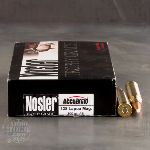 This package contains 20 rounds of Nosler Custom Trophy Grade .338 Lapua Magnum ammunition. Each round is loaded with a 300 grain Accubond polymer-tipped projectile. These bonded core bullets feature a copper-alloy jacket bonded through an exclusive process to a special lead alloy core. Topped with a white polymer tip designed to protect from in-flight deformation and initiate terminal expansion, Accubond projectiles offer impressive long-range accuracy and up to 70 percent weight retention.