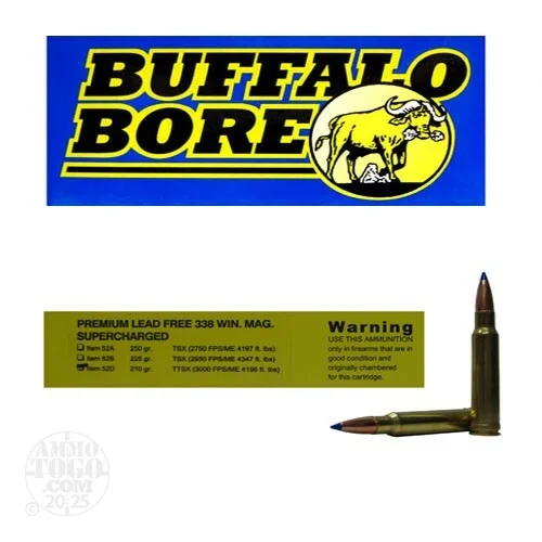 This is 300 Win. Mag. Supercharged Buffalo Bore 210gr. Barnes TTSX Lead FreePolymer Tip Ammo. This bullet is best suited for use on animals under 800 lbs where the greater impact damage is beneficial and where enormous amounts of penetration are wasted.Tipped TSX features the same 100-percent copper body with multiple rings cut into the shank. It delivers the same gnat’s-eyelash accuracy and “dead right there†performance—but with an added polymer tip that boosts BC and improves long-range ballistics. The tip and a re-engineered nose cavity provide even faster expansion. Complete penetration, virtually 100-percent weight retention and four razor-sharp cutting petals that double bullet diameter. This ammo is brass cased, boxer primed, non-magnetic and non-corrosive. It comes packed in 20rd. boxes. Muzzle Velocity: 3000 fps.