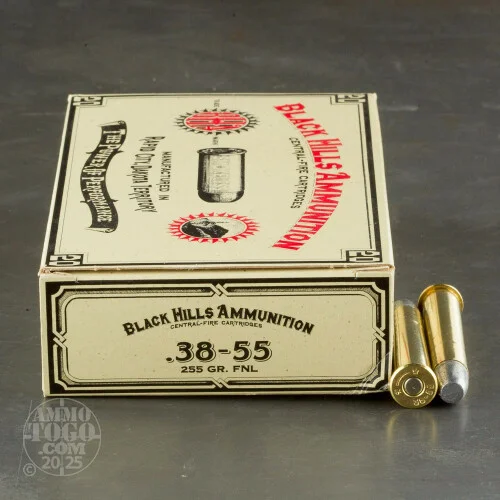 This is .38-55 Win Black Hills 255gr. Flat Nose Lead Ammo. This cowboy action ammo is loaded to just the right pressure and has muzzle velocity of 1250fps. This ammo comes packed 20rds. per vintage style box.
