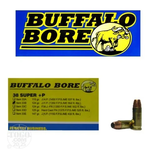 This is 38 Super Auto Buffalo Bore 124gr. +P Jacketed Hollow Point Ammo. This full power 38 Super Auto+P loads feature flash suppressed powders so the shooter will not be blinded if firing in low light. Feeding, function and accuracy is very good. This ammo is brass cased, boxer primed, non-magnetic and non-corrosive. It comes packed in 20rd. boxes. Muzzle Velocity: 1350 fps.