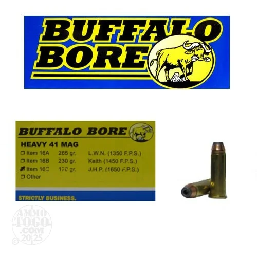 This is .41 Mag Heavy Buffalo Bore 170gr. Jacketed Hollow Point (JHP)Ammo. Buffalo Bore Heavy .41 Mag. ammo adds more power than ever before to the .41 Mag. Muzzle velocity of 1650fps. This ammo is brass cased, boxer primed and non-corrosive.This ammo is packed in 20rd boxes.
