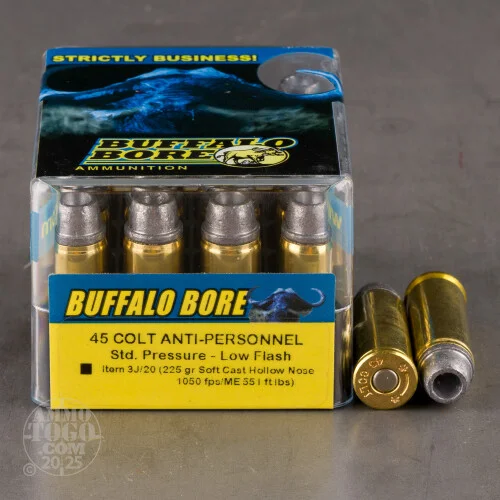 This is 45 Colt Buffalo Bore 225gr. Anti-Personnel Soft Cast Hollow Nose Ammo. We developed this bullet to be soft (6 BHN) enough to mushroom at impact speeds around 750 fps, yet we wanted it hard enough (pure lead is 4 BHN) not to lead a normal revolver barrel. This bullet accomplishes both requirements. Additionally it is gas checked, so it would be virtually impossible to lead even rough barrels or forcing cones. Depending on impact velocities, expect about 18 inches of penetration in flesh and bone, which will give ample penetration. This ammo is brass cased, boxer primed, non-magnetic and non-corrosive. It comes packed in 20rd. boxes. Muzzle Velocity: 1050fps.