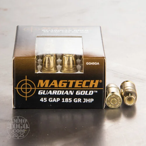This is .45 GAP Magtech 185gr. Jacketed Hollow Point Ammo. The reliability of this ammunition is a result of extensive quality control. Each phase of the loading process undergoes a thorough inspection, with the final inspection using a sophisticated electronic measurement system to determine correct chamber feeding. Over 20 national police agencies and countless local agencies throughout the world depend on Magtech products for their training and service ammunition. This ammo comes packed in 20rd. boxes.