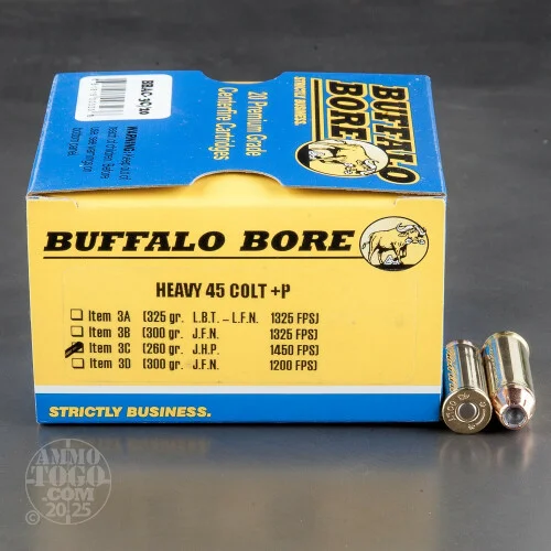 This is 45 Long Colt Heavy Buffalo Bore 260gr. Jacketed Hollow Point Ammo. Is good for Big Game up to 350 lbs. This Heavy .45 Colt +P loadis safe in alllarge frameRuger revolvers (includes Blackhawk, Super Blackhawk, all pre-2005 Vaquero, Bisley, Redhawk). These Heavy .45 Colt +P loads are NOT intended for the New Model Vaquero (small frame). This ammo is brass cased, boxer primed, non-magnetic and non-corrosive. It comes packed in 20rd. boxes. Muzzle Velocity: 1450fps.