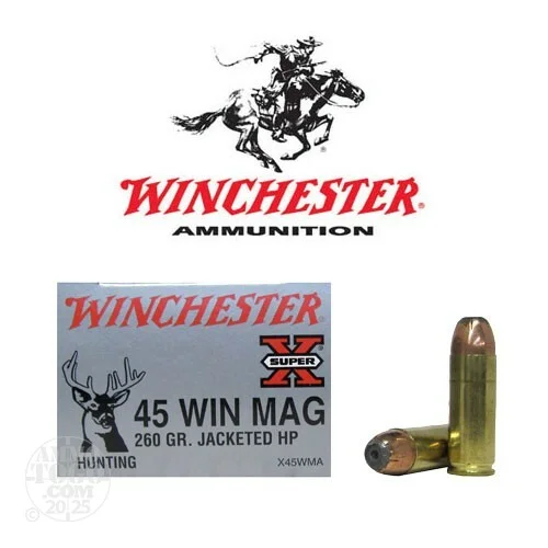 This is 45 Win Mag Winchester Super X 260gr. Jacketed Hollow Point Ammo. This Winchester round featuresmassive energy deposit, accuracy, optimum penetration, and consistent expansion.This ammo is packed in 20rd. boxes.