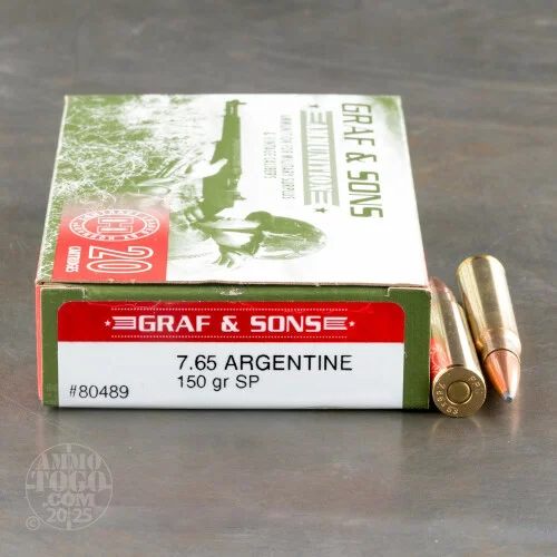Hornady’s reputation for quality ammo is well known and their foray into the 7.65 Argentine ammo market provides a great resource for shooters. Each brass casing is Boxer primed, reloadable, and topped with a 150 grain soft point (SP) bullet. These rounds are ideal for range training, but the SP is also a solid choice for hunting. This 7.65 Arg. ammo rockets out of the muzzle at 2800 fps with 2611 ft/lbs of energy.