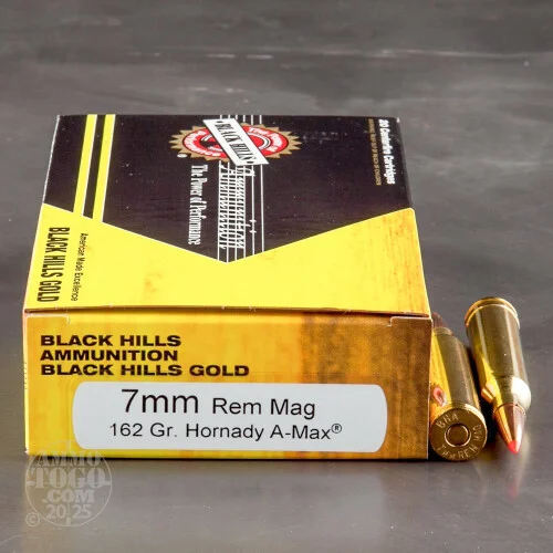 This is 7mm Rem Mag Black Hills Gold 162gr. A-Max Polymer Tip Ammo. This ammo has the Hornady A-Max Tip. Black Hills Ammunition is highly respected all over the country. Black Hillssupplies all five US military branches with ammunition. There are many Law Enforcement Agencies using Black Hills nationwide. Theyonly use the best components available. This factory new ammo is very accurate, dependable, 100% non-corrosive, boxer primed and reloadable. Black Hills. This ammo is brass cased, non-corrosive,comes packed in 20rd. boxes.