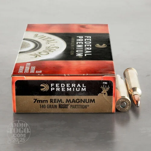 This is 7mm Rem MagFederal 140gr. Vital-Shok Nosler Partition Ammo.This world renound bullet features a partitioned lead core and shank that allows the front half to mushroom while the rear core remains intact for deep penetration. This ammo is brass cased and boxer primed, it comes packed in 20rd. boxes.