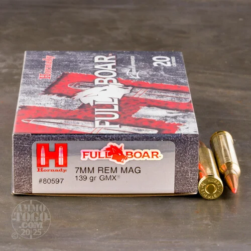 Full Boar ammo tells you up front what it does best–bring down wild hogs! These 7mm Remington Magnum cartridges fire a polymer-tipped solid copper Hornady GMX bullet that rips through hide and bone for a quick kill on the animal. Each round in this box of 20 fires a 139 grain version of the GMX. These cartridges are loaded in Grand Island, Nebraska and use non-corrosive Boxer primers and brass cases.r