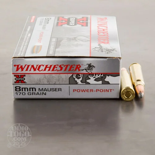 This is 8mm Mauser Winchester Super-X 170gr. Power Point Ammo. Winchester Super-X Power Point ammo is designed to retain velocity over long ranges. The unique soft nose jacketed design delivers maximum energy on target. Notches around the jacket mouth improve and ensure uniform, rapid expansion. This ammocomes packed in 20rd. boxes.