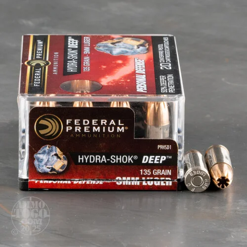 rThis 9mm cartridge’s 135 grain projectile also features a hard notched jacket which assures reliable feeding in a semi-automatic, facilitates penetration, and controls expansion. The Hydra-Shok Deep projectile reliably penetrates ballistic gel to a depth of 15 inches, a distance determined ideal by modern FBI protocol and which minimizes the risk of overpenetration. This cartridge further offers a brass casing, which is plated with nickel in order to make feeding and ejection smoother, as well as to make it more visible during chamber checks in darkened environments.