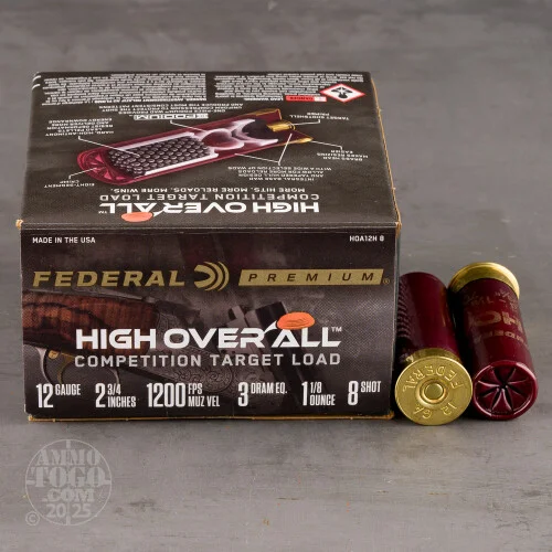 rThis is Federal’s High Over All ammunition. Each shell is packed with 1-1/8 ounces of #8 shot – a great size for any pastime that revolves around wrecking clay discs. Federal protects this shell’s shot pellets against pattern-widening deformation by making them out of hard, high-antimony lead. The Podium wad, which features a singular cylinder-shaped compression zone, gives the shot even greater protection against becoming too flat to pattern efficiently. The Podium’s ability to compress also means it absorbs recoil energy. That spells more comfortable ignition with less accompanying muzzle rise!