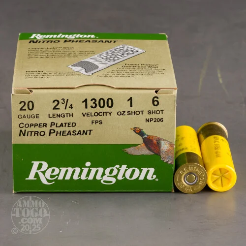 This is20 Gauge Remington Nitro Pheasant Load 2 3/4″ 1oz. #6 Shot Ammo.For pattern, energy, and performance, nothing beats Nitro Pheasant. The best of their pheasant load offerings, Nitro Pheasant uses Remington’s own Copper-Lokt copper-plated lead shot with high antimony content, the hardest lead we make for hunting. Hard shot stays rounder for truer flight, tighter patterns, and greater penetration. Nitro Pheasant Loads will give you the maximum pattern density and lethal energy needed to bring down these tough birds. Muzzle velocity of 1300fps. This ammo comes packed 25rds. per box.