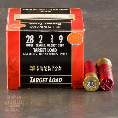 This is 28 Gauge Federal Gold Medal Target 2 3/4″ 3/4oz. #9. Federal Premium Gold Medal Plastic Target Shotshells provide optimum performance in all clay target disciplines. These target loads feature tournament grade components, consistent velocities, and uniform patterns which deliver hard hitting, target breaking performance. Muzzle velocity is 1230 fps. This ammo is packed in 25rd. boxes.