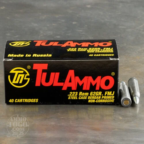 This .223 Remington ammo from Tula is a great deal for high volume shooters. Each cartridge in this box of 40 fires a 62 grain bimetal jacketed bullet (these may not be allowed at all indoor ranges due to their magnetic properties). These rounds are loaded in Tula, Russia using non-corrosive Berdan or Boxer primers and non-reloadable steel cases. The steel cases have polymer coatings for improved cycling. Grab a few boxes for your AR-15 or other .223/5.56 NATO rifle!r