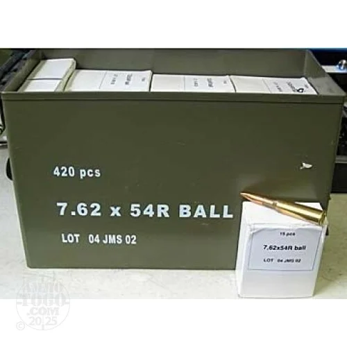 This is 7.62x54R U.S. Government Contract 147gr. FMJ Ammo. This ammo was made for the U.S. Government under a contract for Iraq. This ammo is brass cased, non-corrosive and has a 100% non-magnetic FMJ bullet. This ammo can be fired at any gun range because it gas a non-magnetic bullet. This ammo is packed in 15rd. boxes, 420rds. per ammo can.