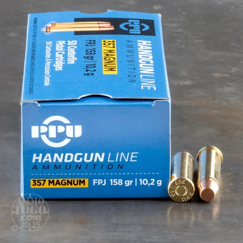 rThis round’s 158 grain FPJ projectile has a full metal jacket, a cost-effective design favored for its ability to keep lead away from a pistol’s riflings. Its flat point, however, transfers a whole lot of its energy instantaneously on impact, effectively letting it damage its target more severely. That broad meplat further stamps a tidier hole through paper, making it a suitable choice for training with conventional paper targets.