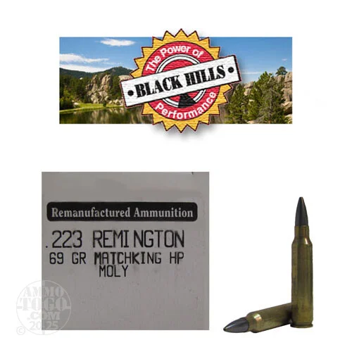 This is .223 Black Hills 69gr. Remanufactured Seconds Sierra MatchKing Hollow Point Moly Coated Ammo. The moly coating reduces barrel wear, residue in the barrel, and in some cases even enhances velocity.This Black Hills remanufactured ammunition is produced on the same production line as the Black Hills new manufactured ammunition and is subject to the same testing and inspection procedures as new ammunition. This ammo goes through Black Hills stringent inspection tests and due to minor cosmetic blemishes on the bullet or casing, it then becomes factory seconds (white box) ammo. Performance is not affected. This is premium ammo, with a great savings. Black Hills supplies all five US military branches with ammunition. There are many Law Enforcement Agencies using Black Hills nationwide. They only use the best components available. Black Hills Ammunition is highly respected all over the country. This ammo is very accurate, dependable, 100% non-corrosive, boxer primed and reloadable. It comes packed in 50rd. boxes.