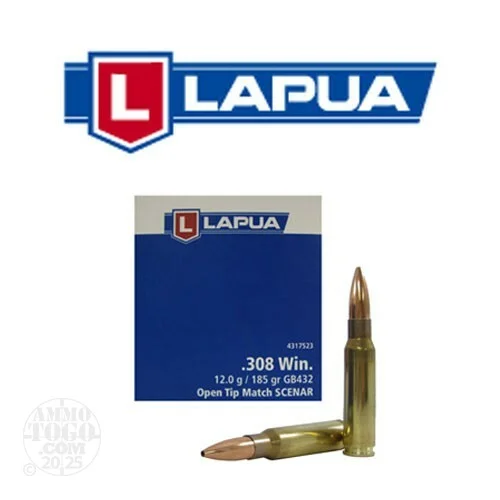This is a308 Win Lapua 185gr. Scenar Open Tip Match Ammo.Popular, precise, and perhaps the most versatile target shooting cartridge, the .308 Winchester is one of the most popular centerfire calibers today. Lapua’s .308 Winchester is an excellent choice when you want a cartridge that is sure to perform across a range of disciplines in competition and hunting. The first choice for serious target competition, Lapua Scenar OTM bullets have given suberb results at long ranges and bench rest shooting.The Scenar bullets have the IBS World Record in 600 yard Heavy Gun 5-shot group (0.404â€) and also hold the official world ISSF record of 600 out of 600 possible, an unbeatable score. When you need the highest accuracy possible, choose Lapua. This ammo is brass cased, boxer primed, and non corrosive. It comes packed in 50rd. boxes. Muzzle Velocity: 2477 FPS.