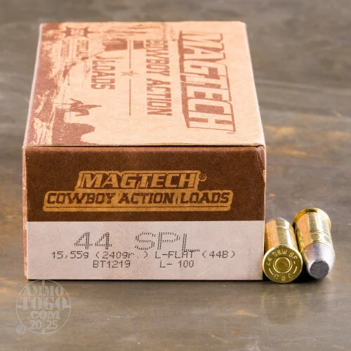 This is 44 Special MagTech Cowboy Action 240gr. Lead Flat Nose Ammo. This ammo is specifically designed to be safe to fire in all 44 special revolvers and long guns. It also meets the criteria of all cowboy action contest rules. It has a muzzle velocity of 761 FPS. This ammo is brass cased, boxer primed and 100% non-corrosive. It comes packed in 50rd. boxes.