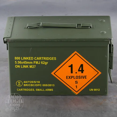 rAll 800 of these rounds are loaded neatly in an ammo can. They’ll slide right out as they’re fired one by one, and the high quality steel can seals tight and handles well enough to be of great use for decades.