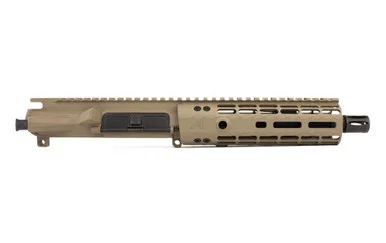 Aero Precision M4E1 Complete Upper, 7.5″ 5.56 Barrel, EM-7 Gen 2 Handguard – FDE CerakoteThis Complete Upper includes our Gen 2 Enhanced Handguard! Key features include the addition of quick disconnect sling sockets, enhanced milling design for grip and visual appeal and a new profile for the picatinny top rail.Includes:M4E1 Enhanced Assembled Upper ReceiverEnhanced Handguard of choice7.5″ 5.56 Pistol Length CMV BarrelLow Profile Gas Block and Pistol Length Gas TubeProduct comes assembledThe muzzle brake that comes with this complete upper receiver is NOT pinned nor welded to this barrel.M4E1 Upper Features:Forged from 7075 T6 aluminumPrecision machined to M4E1 specsM4 feedrampsMatte black hard coat anodized Mil 8625 Type 3 Class 2Laser engraved T-marks (Anodized only)Comes assembled, with port door and forward assist installedAccepts standard AR15/M16 componentsHandguard mounting platform is forged into the receiverWorks with Aero Precision handguards but also fits most BAR-system handguardsBarrel nut and wrench are includedGen 2 Enhanced Handguard Features:1pc free float designBuilt in anti-rotation tabsScalloped railsContinuous top rail1.78″ inside diameter fits most muzzle devices and 1.5″ suppressorsCompatible with low profile gas blocksGen 2 Feature – Quick disconnect sling socket at the 3, 6 and 9 o’clock positionsGen 2 Feature – Additional milling along flats to aid with gripping and add visual appealGen 2 Feature – New profile for the continuous picatinny top rail7.5″ 5.56 Pistol Length Barrel Features:Chamber: 5.56Length: 7.5″Twist: 1 in 7Threading: 1/2″x28Material: Chrome Moly VanadiumFinish: QPQ corrosion resistant finish both inside and outGas Block: .750Gas System Length: PistolWeight: 17.25ozM4 Barrel ExtensionHP and MPI TestedSpecifications:Platform: AR-15Series: M4E1Caliber: 5.56 NATOBarrel Length: 7.5″Weight(s) KeyMod: 38.72 oz / M-LOK: 38.72 oz / Quad Rail: 40.32 oz**Does not include BCG or Charging Handle**