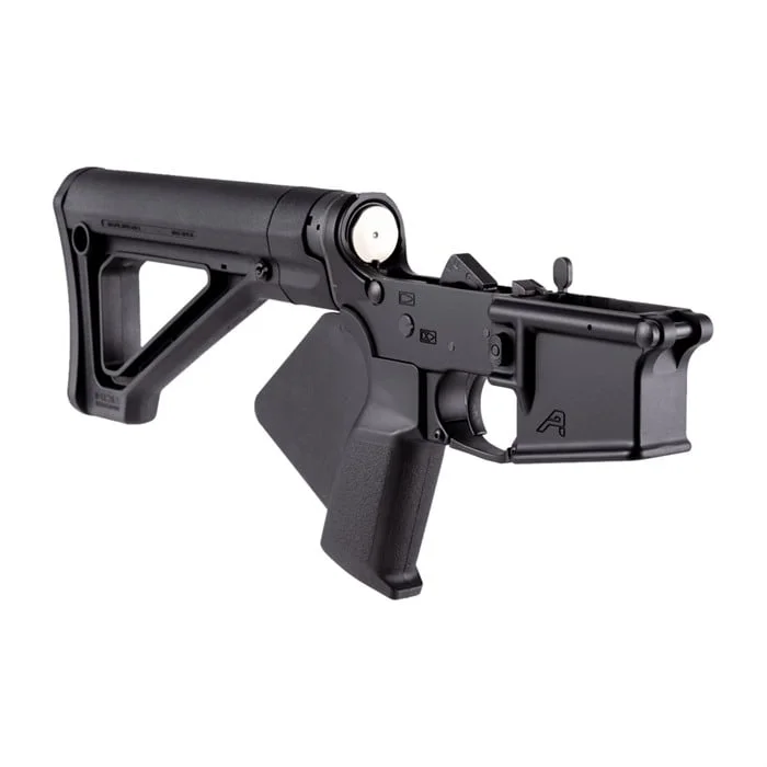 The Aero Precision AR-15 Featureless Complete Lower Receiver includes a Strike Industries Simple Featureless Grip and Magpul MOE® Fixed Carbine Stock. Small parts are installed!