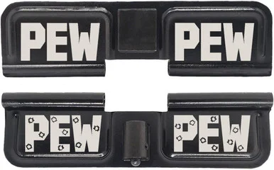 This ejection port door dust cover comes engraved with PEW PEW on the outside and PEW PEW with bullet holes on the inside!