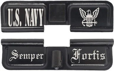 This ejection port door dust cover comes engraved with US Navy and logo on the outside, and Semper Fortis slogan on the inside.